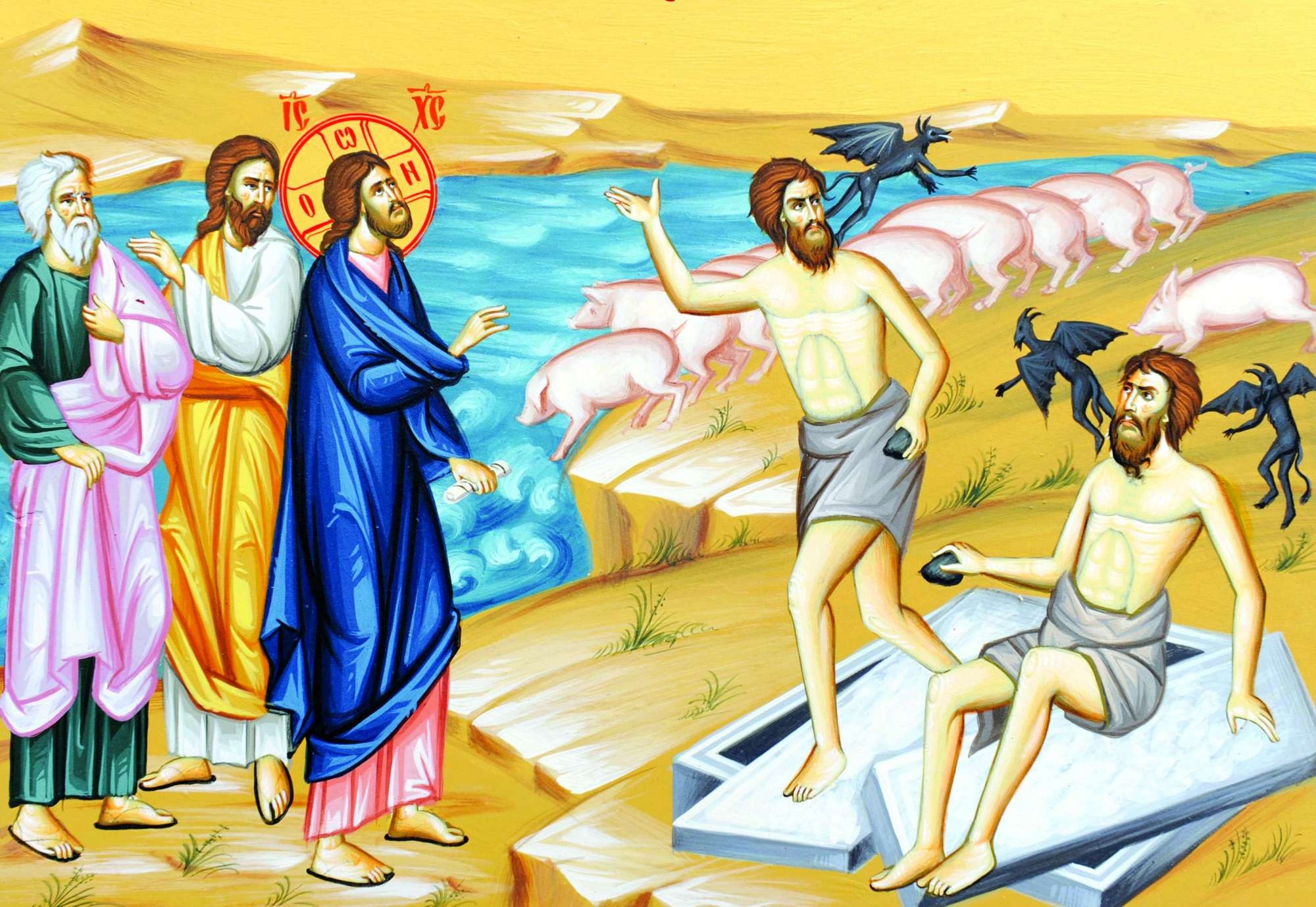 În vremea aceea, trecând Iisus dincolo, în ținutul Gadarenilor, L-au întâmpinat doi demonizați care ieșeau din morminte, atât de cumpliți, încât nimeni nu putea să treacă pe calea aceea.