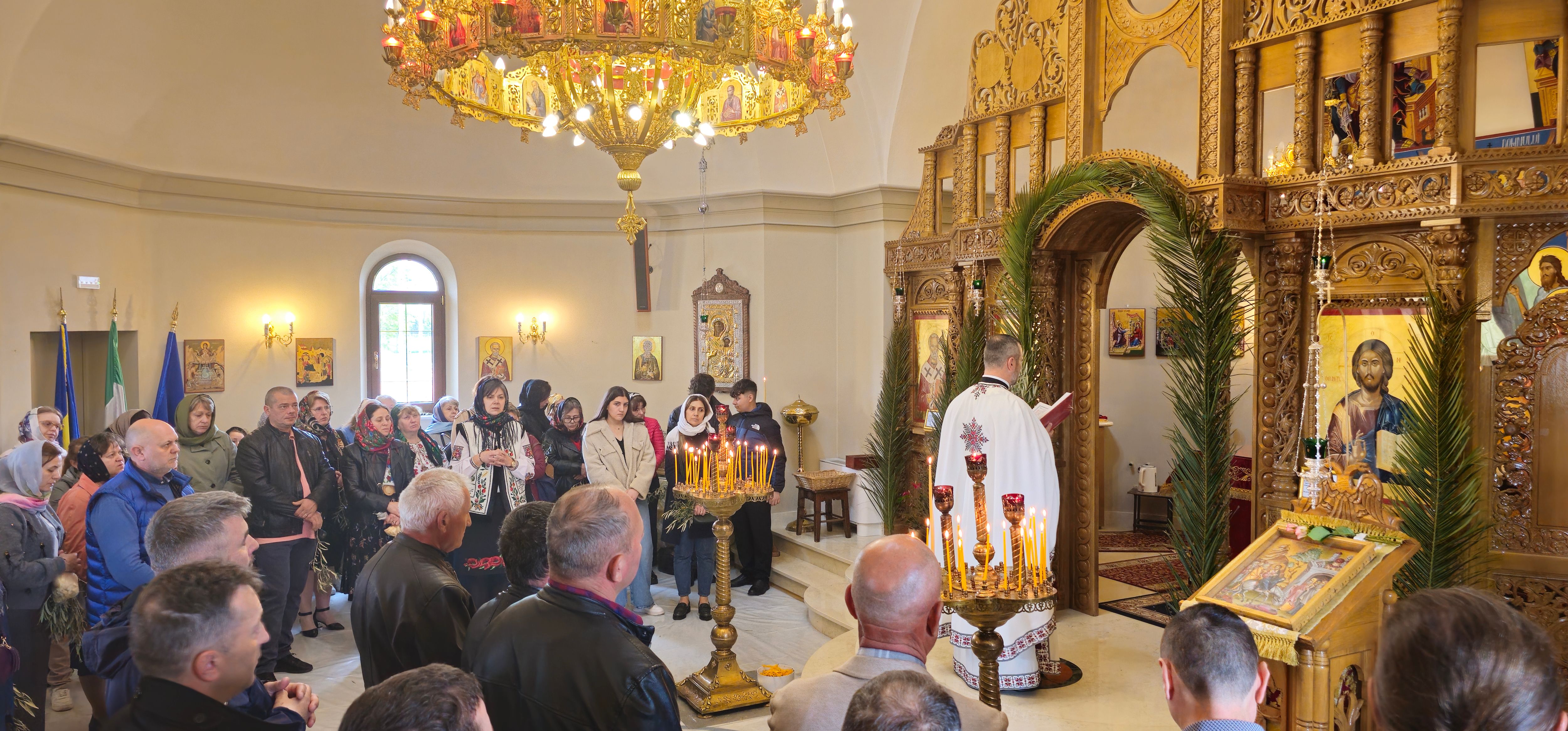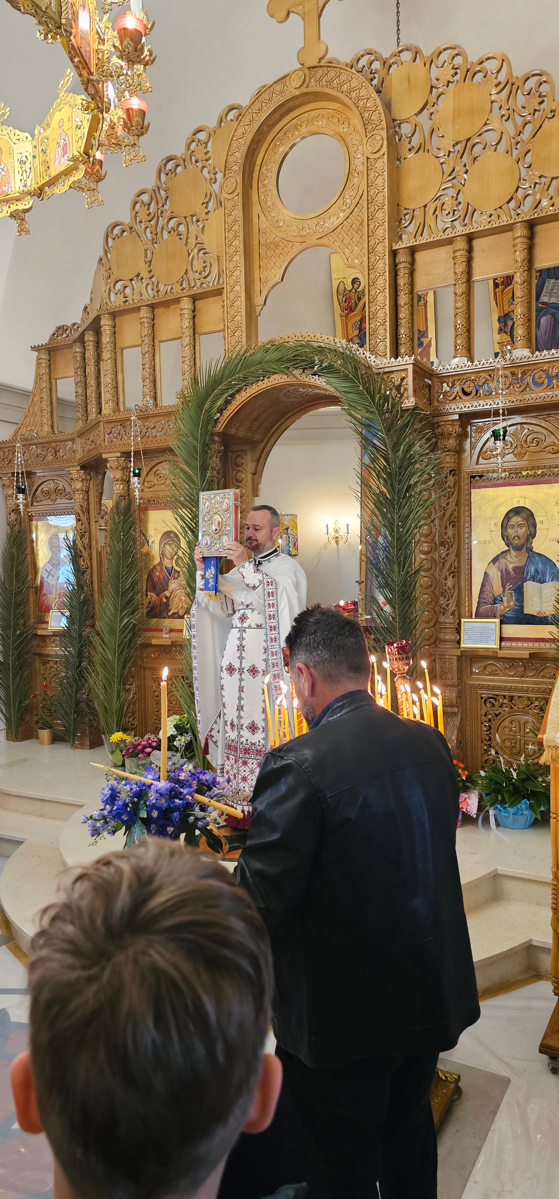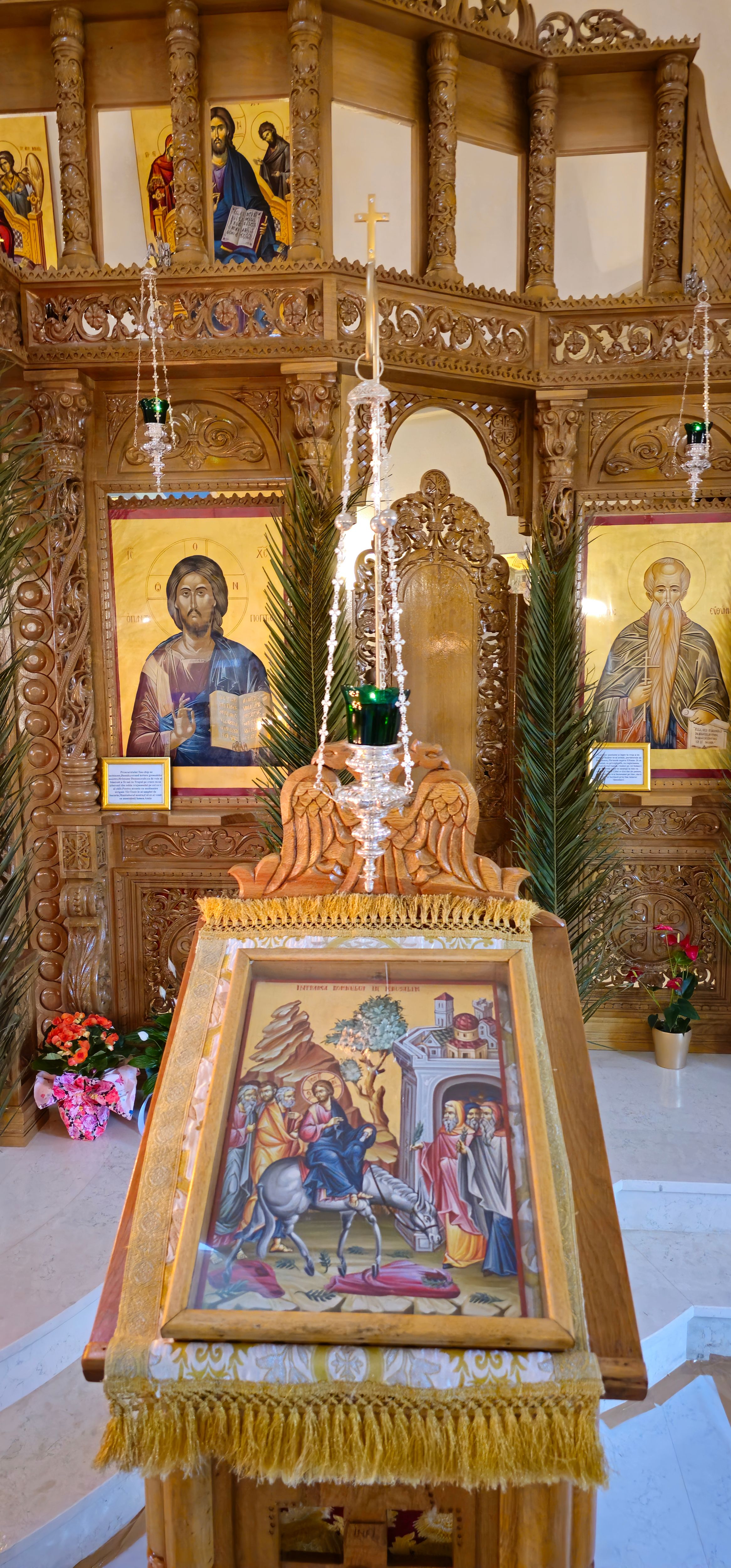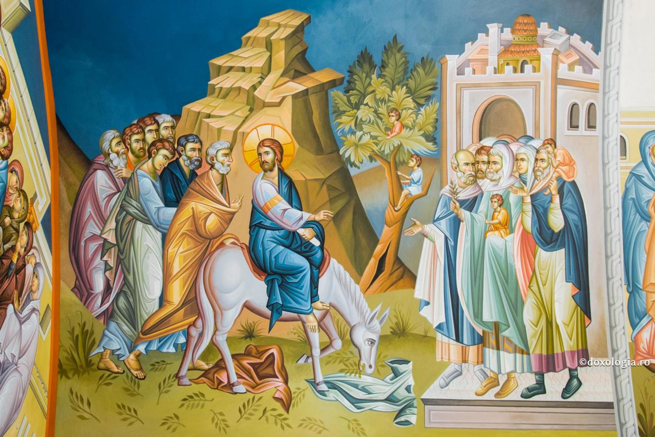 A doua zi, mulţimea cea mare, care se adunase la sărbătoare, auzind că Iisus vine în Ierusalim, a luat ramuri de finic şi a ieşit întru întâmpinarea Lui şi striga: Osana! Binecuvântat este Cel ce vine întru numele Domnului, Împăratul lui Israel!