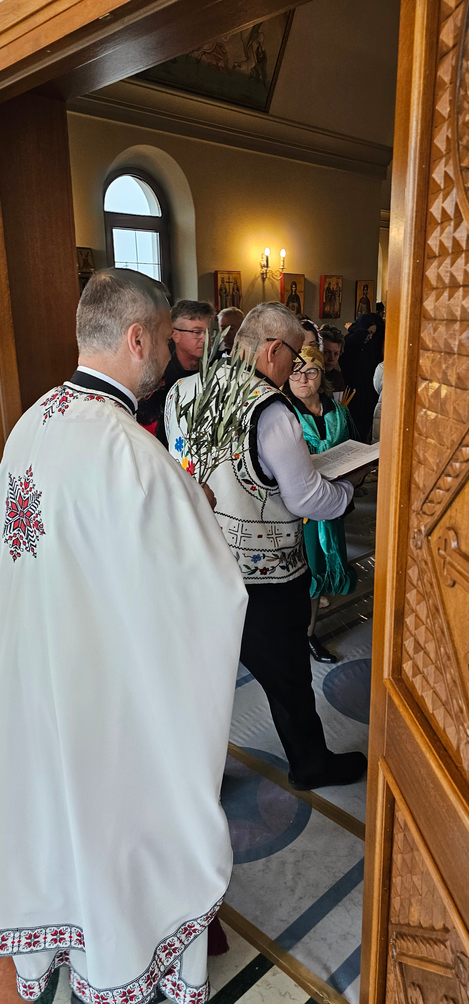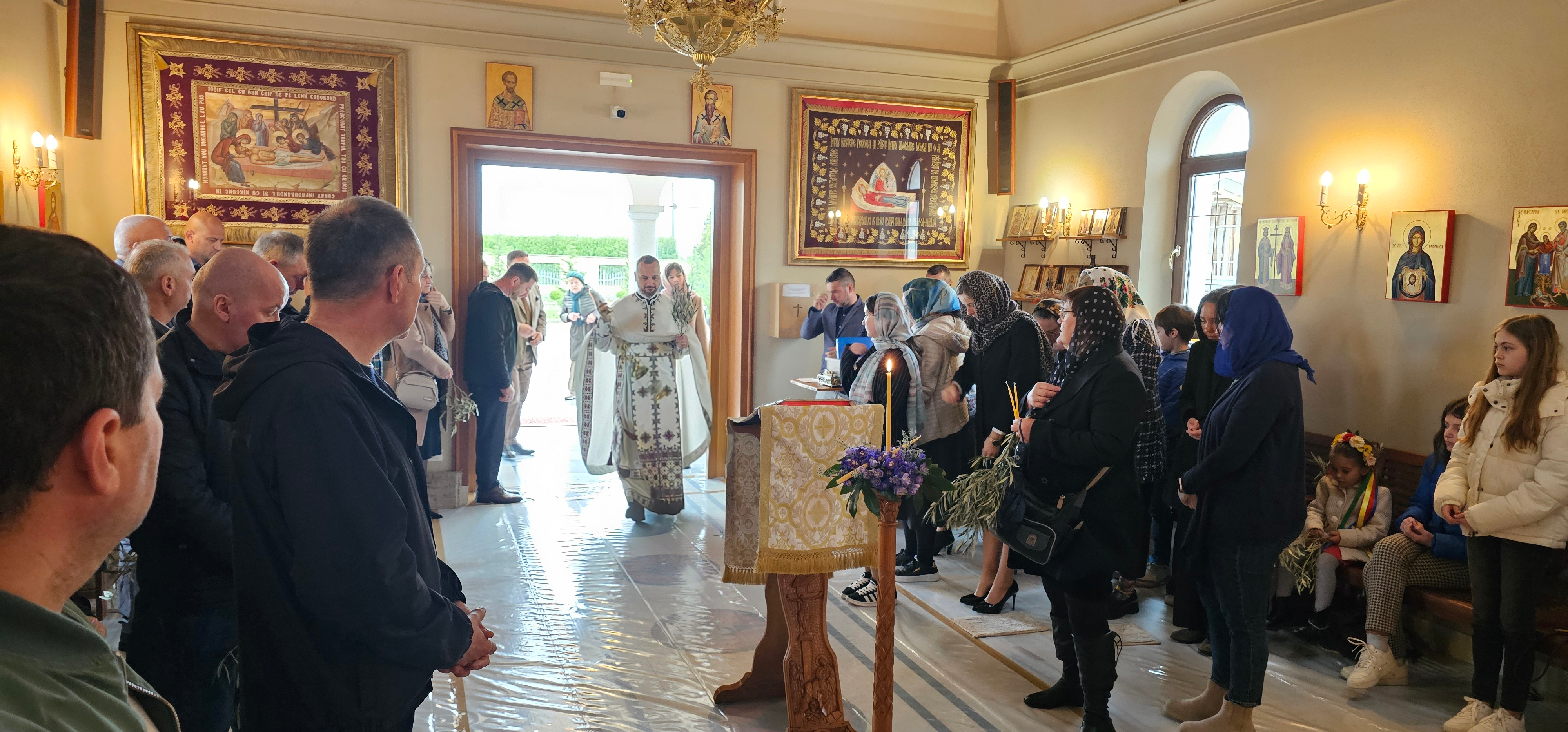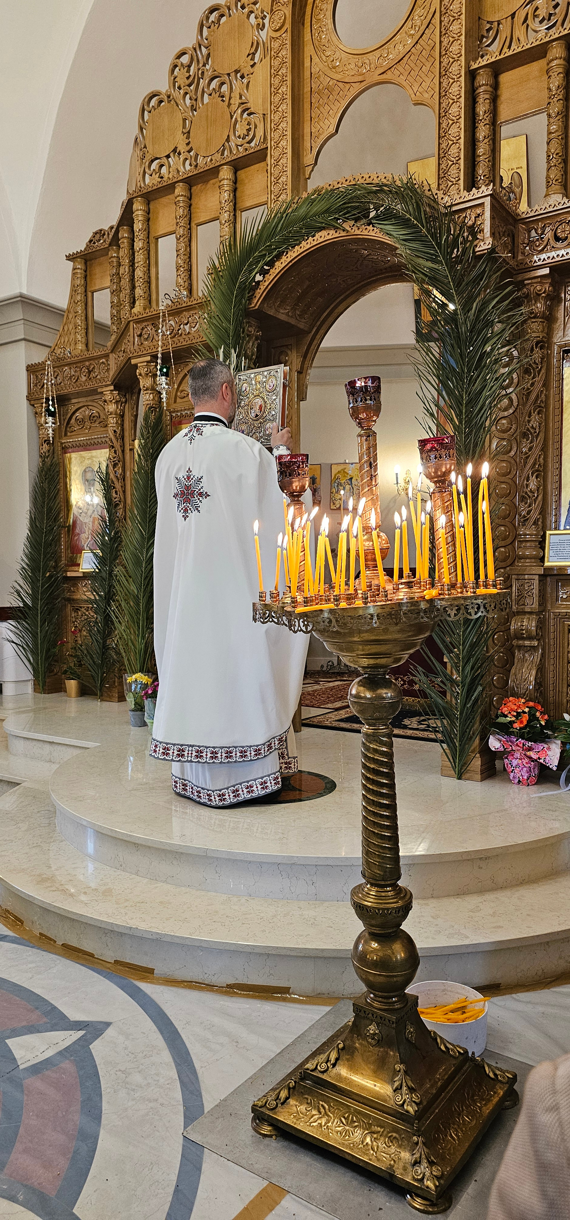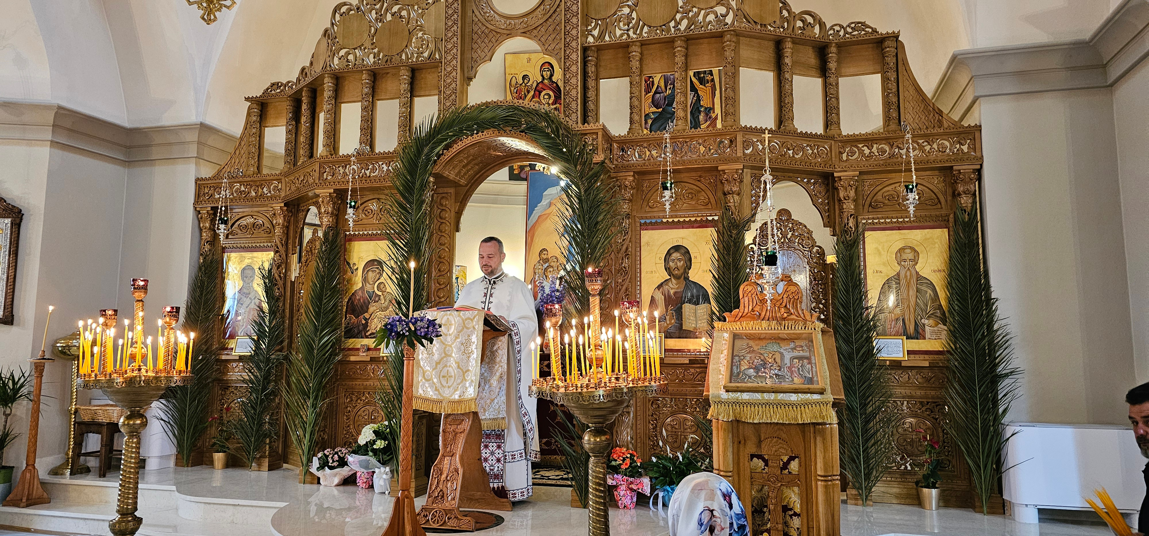 A doua zi, mulţimea cea mare, care se adunase la sărbătoare, auzind că Iisus vine în Ierusalim, a luat ramuri de finic şi a ieşit întru întâmpinarea Lui şi striga: Osana! Binecuvântat este Cel ce vine întru numele Domnului, Împăratul lui Israel!