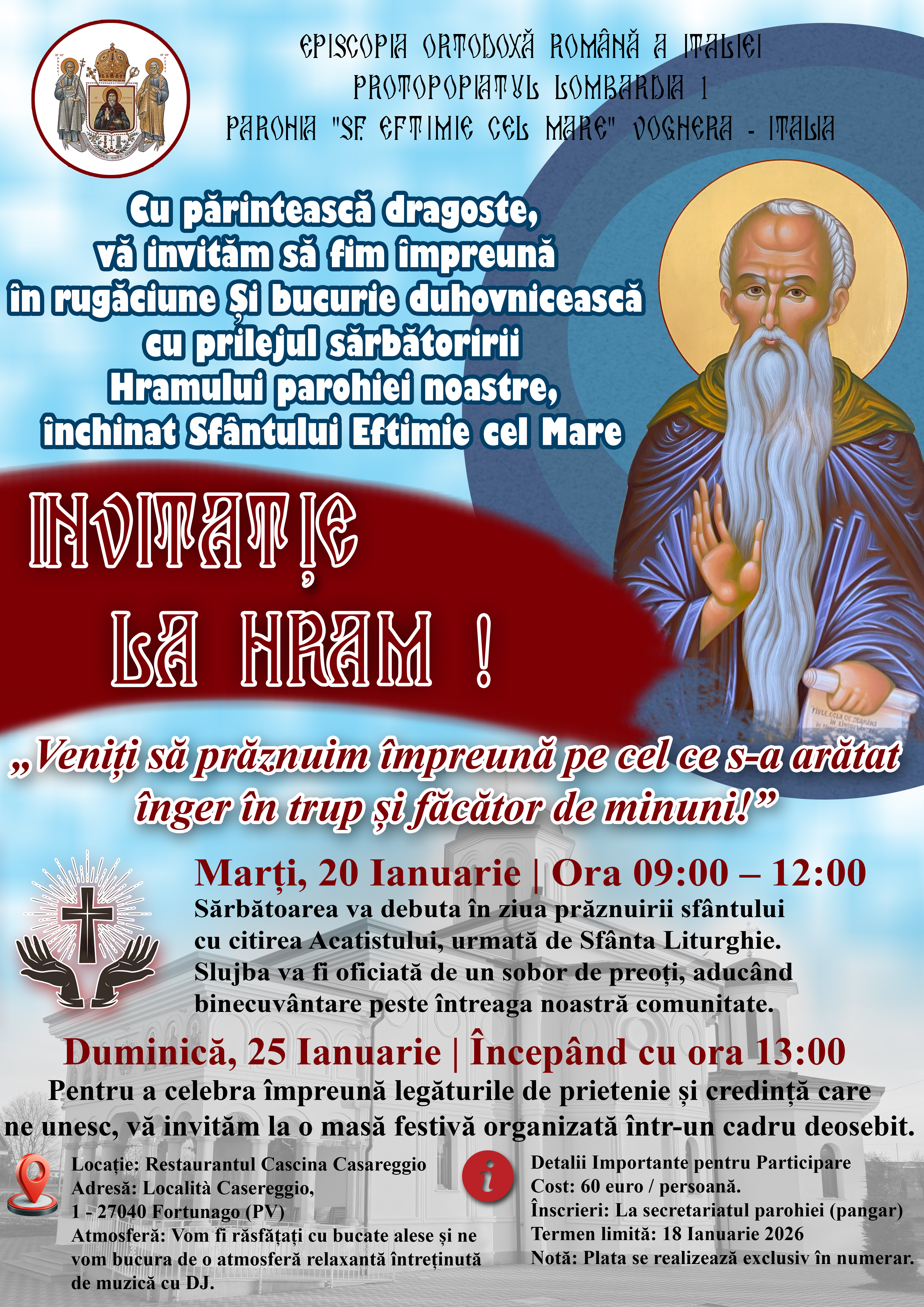 Cu inimile pline de recunoștință și bucurie, comunitatea noastră se pregătește să îmbrace haine de sărbătoare. Avem deosebita onoare de a vă invita să participăm împreună la sărbătorirea Hramului parohiei noastre, închinat Sfântului Eftimie cel Mare. Sfântul Eftimie, supranumit „îngerul în trup” și marele făcător de minuni al pustiei, rămâne peste veacuri un model de smerenie și de dăruire totală față de Dumnezeu, învățându-ne că prin rugăciune și blândețe putem transforma orice deșert în grădină roditoare.
