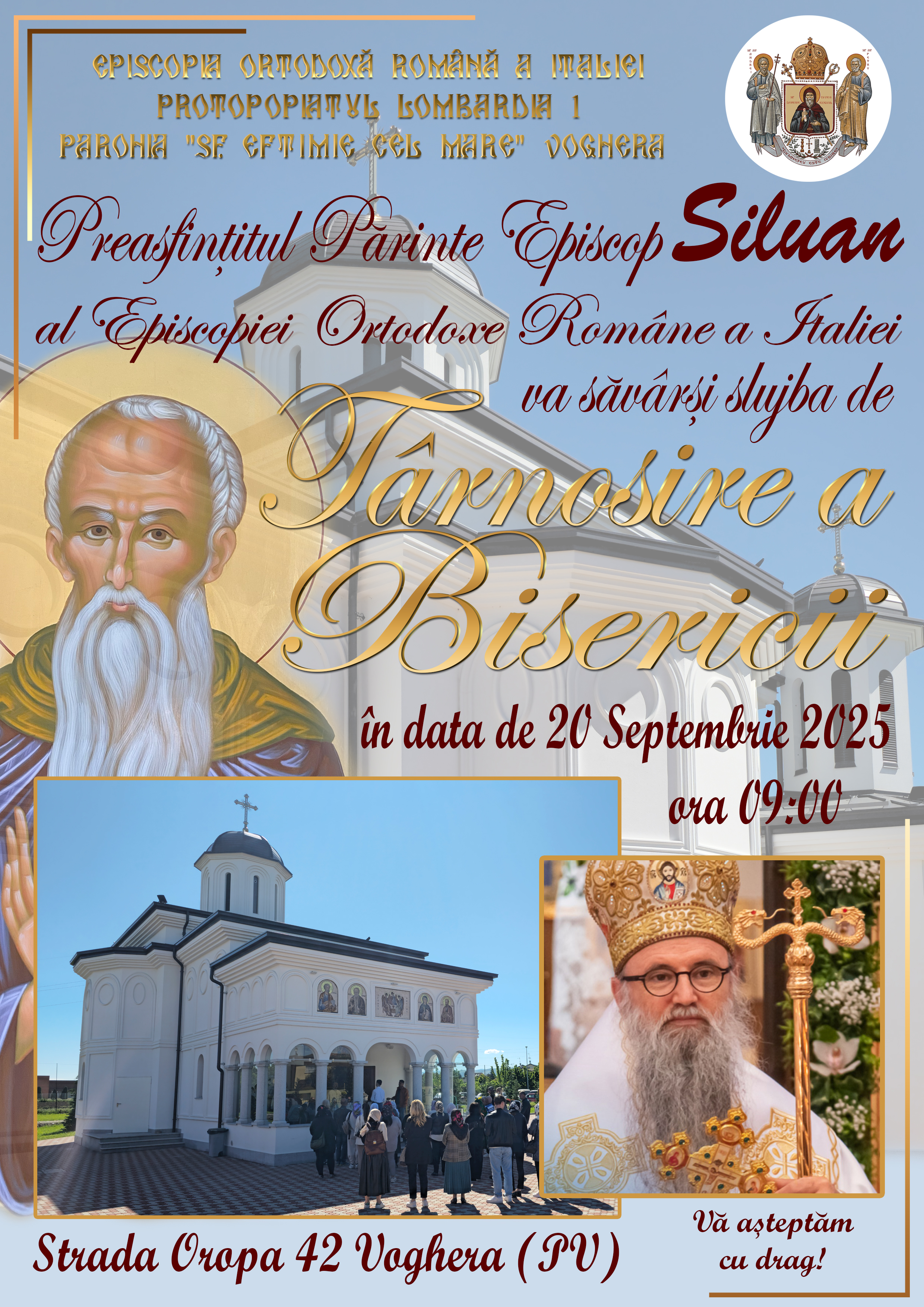 Cu aleasă bucurie duhovnicească vă invităm să luaţi parte la slujba de Târnosire a Bisericii cu hramul „Sfântul Eftimie Cel Mare” din Voghera (PV), Strada Oropa 42, care va avea loc în ziua de Sâmbătă 20 Septembrie 2025 ora 09:00.